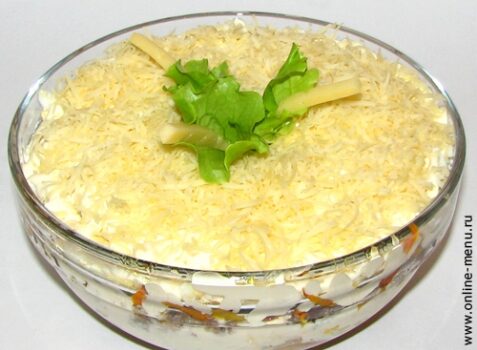 Ингредиенты салата1 банка рыбных консервов4 яйца1 луковица1 морковь300 г. грибовмайонез Способ приготовления салатаШампиньоны порезать и обжарить, посолить, охладить.Лук мелко порезать , морковь натереть на крупной терке и обжарить вместе с луком, охладить.Выложить первым слоем грибы.Каждый слой перемазать майонезом (не много). На грибы выложить половину яиц. Потом из консервы слить лишнюю жидкость, удалить...