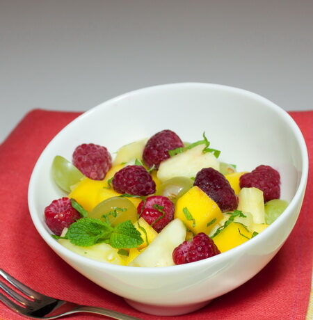 Смешиваем фрукты в салатнике. Добавляем сок лайма, мед и мелко нарубленную мяту. Перемешиваем.